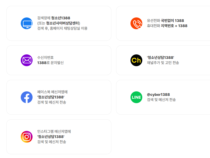 ‣ 인스타그램 상담: 인스타그램 앱에서 ‘청소년상담1388’을 검색한 후 상담 내용을 작성하여 보내기