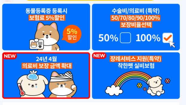 | 질병 및 상해 치료비 | 슬개골 탈구, 고관절 이형성증, 피부 질환, 구강 질환 등 주요 질병과 상해에 대한 치료비 보장 |