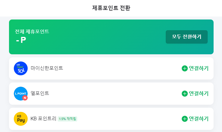2. 전환 가능 포인트 : 마이신한포인트 KB 포인트리, 하나머니, 엘포인트,                                         OK캐쉬백 포인트 , 리WON꿀머니, PAYCO포인트,                                          기아멤버스 포인트, 현대오일뱅크 보너스 포인트