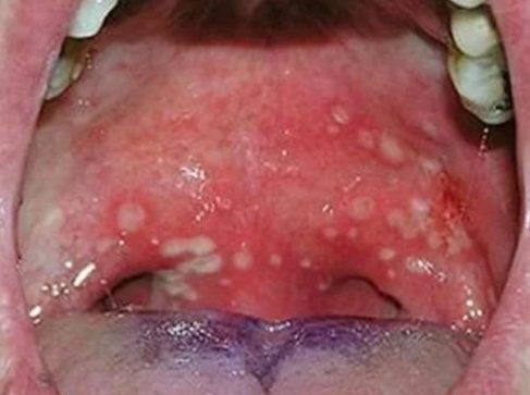 ● 발열 1-2일 후에, 입 안의 볼 안쪽, 잇몸 및 혀에 작은 붉은 반점이 나타나며, 수포 또는 궤양으로 변할 수 있습니다.