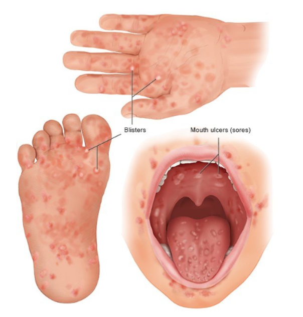 입 안이나 손, 발 등에 수포성 발진이 주된 증상이며, 입안의 수포 때문에 아이가 음식물 섭취를 힘들어할 수 있다.