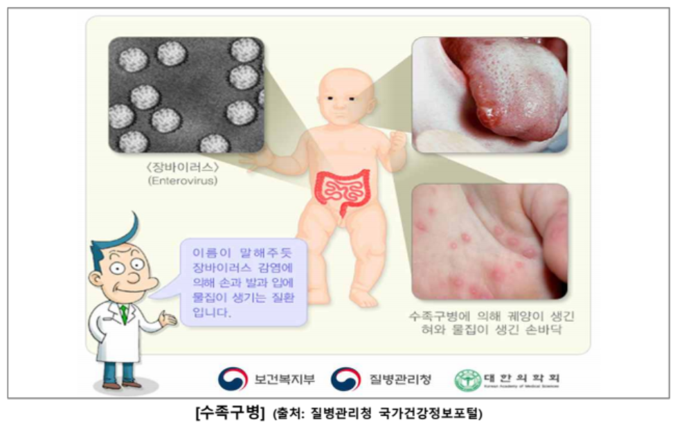 수족구병은 손, 발, 입에 수포와 4~8㎜의 궤양이 나타나는 질환으로 열, 식욕 부진, 기운이 없는 모습이 동반되며 주로 어린이집, 유치원 등 어린이가 많이 모이는 곳에서 감염이 발생한다.
