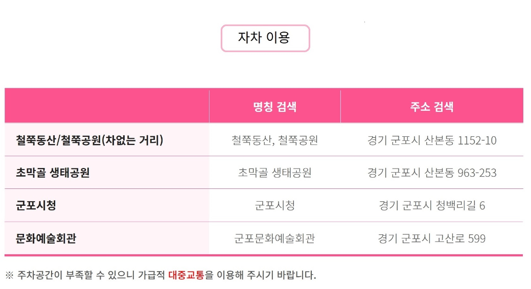 장 소 차 없는 거리, 철쭉동산, 철쭉공원, 초막골생태공원 등 군포시 일원