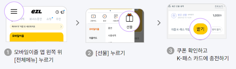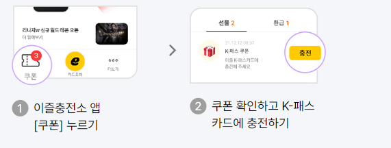 - ● K-패스 이용 적립금은 다음달 20~27일에 이즐충전소 앱에서 쿠폰으로 받을 수 있어요.