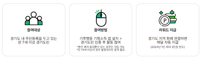 - 탄소중립 실천 활동에 대한 사회적 가치를 평가하여 기회소득(리워드)를 지급하는 경기도 정책 사업입니다.
