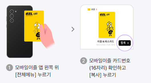 - ● 이즐충전소 앱에 카드를 먼저 등록한 후, K-패스 앱/홈페이지에 카드번호를 등록해주세요.