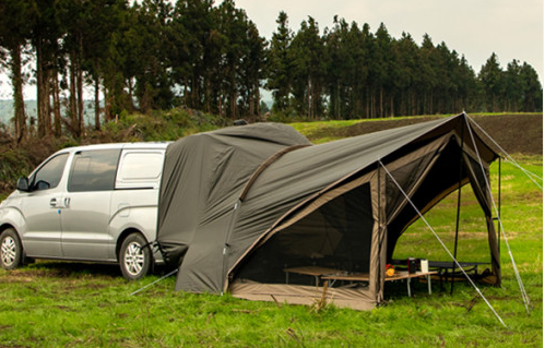 차량 후방 및 지붕에 결합해서 사용하는 텐트로 보통 SUV, 밴, 트럭과 같은 차고가 있는 차량에 사용하기 적합한 텐트다. 차가 있어야만 사용이 가능하고 장소와 땅의 상태에 관계없이 내가 원하는 곳이면 어디든 캠핑이 가능하다.