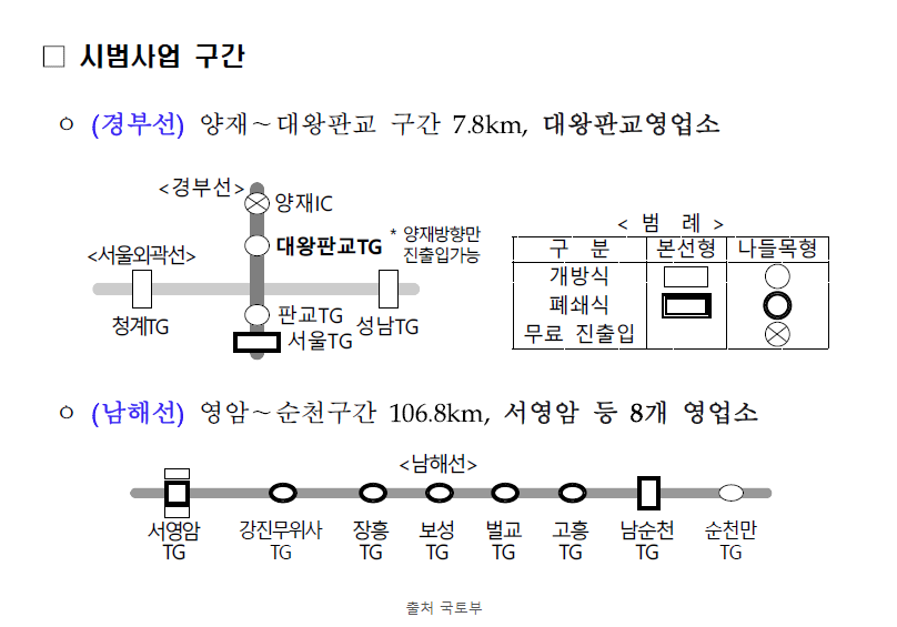 국토부는 오는 28일부터 1년간 경부선의 양재~대왕판교 구간의 대왕판교영업소와 남해선의 영암~순천 구간의 서영암영업소 및 강진무위사·장흥·보성·벌교·고흥·남순천·순천만영업소 등 8곳에서 무정차 통행료 결제 시범사업을 진행할 예정이다.