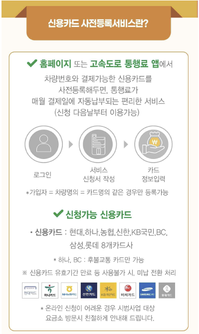 한국도로공사 통행료 누리집 또는 통행료 앱에서 차량번호와 신용카드를 미리 등록하면 요금소 통과 시 등록된 신용카드로 자동 납부된다.