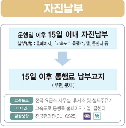 2. 자진납부 방식: 운행일 이후 15일 이내에 한국도로공사 통행료 누리집·앱·콜센터·전국 요금소에서 직접 납부할 수 있다. 15일 경과 시에는 미납으로 처리돼 우편·문자로 고지서가 발송된다.
