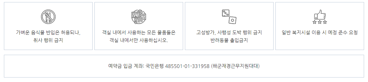 | 예약 취소 방법 | · 인터넷을 통한 예약취소는 "예약 신청" 기간에 가능합니다. 배정 확인 이후의 예약취소는 이용일 기준 2일전 13:00까지 해군 복지포탈체계를 이용하여 취소 바랍니다. · 취소 통보를 하지 않았거나 취소통보를 하였다 하더라도 경기시작 시간이 경과 하였을 경우 위규자로 등록되는 불이익을 당하실 수 있으니 주지하시기 바랍니다. |