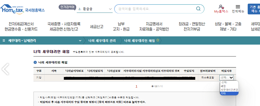 해임 사유로는 폐업, 세무대리인 변경, 기타 세 항목이 있는데 기타를 선택하시고 해임하기를 클릭하시면 해임처리가 완료되었다는 메시지를 확인할 수 있습니다.