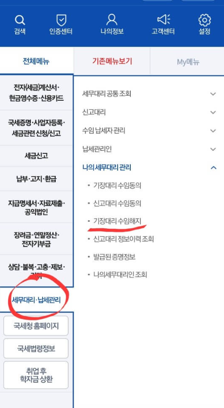 2. 로그인 후 오른쪽 상단 전체메뉴를 클릭하시고 왼쪽메뉴 세무대리. 납세관리- 나의 세무대리관리- 기장대리 수임해지