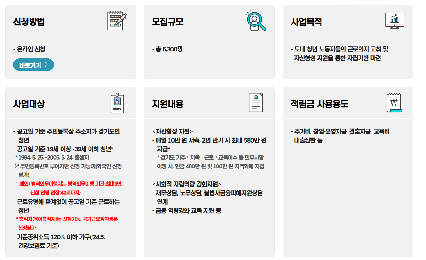 경기도 거주 기준중위소득 120% 이하 가구의 청년이 매달 10만 원을 저축하면 2년 후 경기도 예산으로 580만 원*이 적립되는 통장으로, 경기도 청년 노동자의 노동의지·취업의지를 고취시키고 금융역량을 강화하여 미래에 대한 대응력을 키우기 위해 일하는 청년이라면 받을 수 있는 경기도 청년 노동자 통장 신청 공고가 나왔습니다.